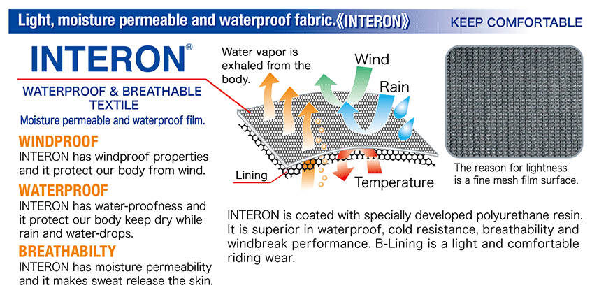 Moisture permeable and waterproof material of "INTERON" is used for light, soft and comfortable inner jacket. (Motorcycle)