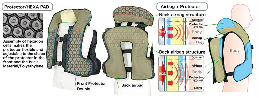Double structure of the airbag and protector for shock-buffering on the neck.