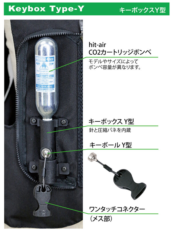 そのため、降車時のワンタッチコネクターの外し忘れに気付く様になっています。 着用時、前方どの方向から引っ張られてもキーボールが抜ける仕組みとなっています。