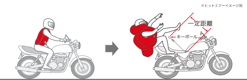 ※ ヒットエアーエアバッグジャケットは、衝撃によるダメージを少しでも和らげるために作られたものであり、接触物の形状及び、衝撃の度合いにより、破損等も考えられます。